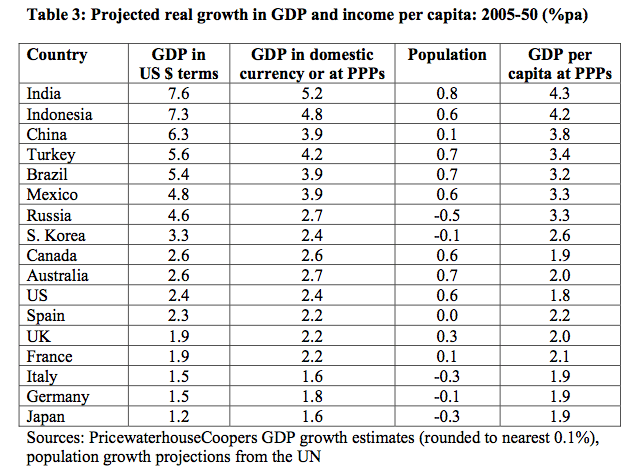 The most popular view among the general public, including research scientists, is that growth will continue practically indefinitely. Let’s call this Scenario A. This forecast by Price Waterhouse Coopers might be typical of what one would expect: