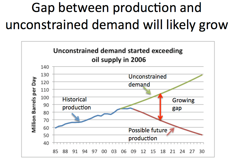 The growing gap is the concern. Regardless of whether oil production remains flat, or declines fairly steeply, we have a major problem. With many people from around the world interested in using oil products, and many new cars in places like China and India, the gap between production and what we would normally consume (if prices were low and credit were available) is likely to continue to grow, even if somehow oil production could be kept flat.