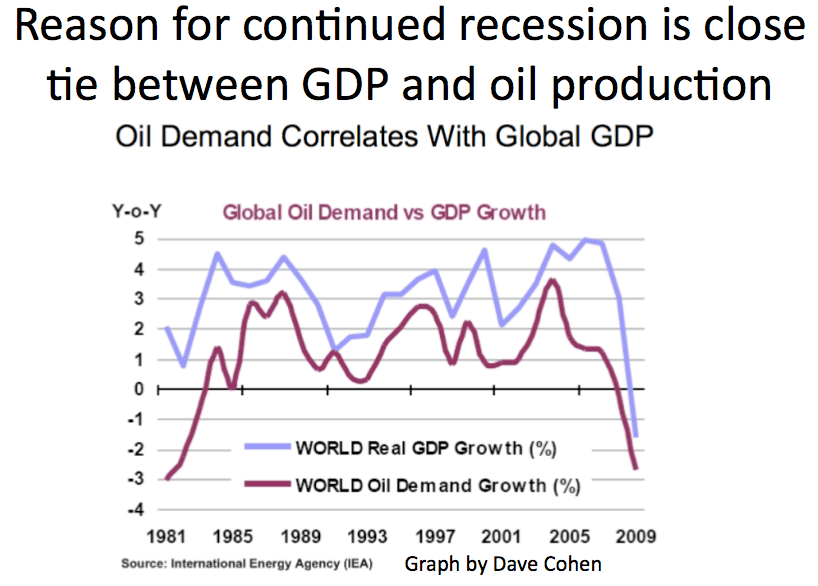 In the recent past, the advanced economies have been able to “offshore” their energy intensive industries to places like China, giving the illusion that countries can get along with only non-energy intensive services like finance. But for the world as a whole, there seems to be a close relationship between growth in oil consumption and GDP growth. Since finance and some other services don’t need much oil to grow, the relationship is not exactly 1:1. Efficiency growth would also tend to raise make GDP growth higher (but declining EROI would tend to lower it).