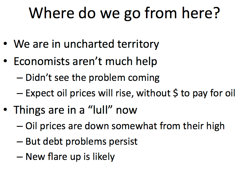 Economic theory seems to say that if oil prices rise, substitutes are likely to be found, and these will tend to bring prices back down. When oil prices rose, we found substitutes, but they were poor substitutes. They are more generally more expensive, when all of the costs are included. Biofuels interfered with food supply; wind is a substitute for natural gas and coal in electricity production, but it is not as a transportation fuel, which is one of the things that we specifically expect to be short of.