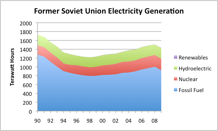 Figure 2 indicates that the FSU gets about 18% of its electricity from nuclear, and this percentage has been rising. Since the Russia (and some of the other FSU countries) are big exporters of natural gas, if this area were to lose its nuclear, it would probably substitute natural gas, while reducing exports to other countries–especially Europe.