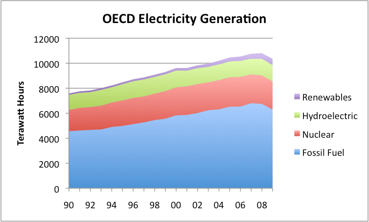 Figure 1 indicates that nuclear accounts for about 22% of electric generation in OECD countries. “Renewables” is the sum of all types of electricity generation (other than hydroelectric) that are referred to as renewables–including burning wood for electricity generation, wind, solar photo voltaic (PV), geothermal, and biogas. Renewable amounts are from EIA data; the other amounts are from BP data.