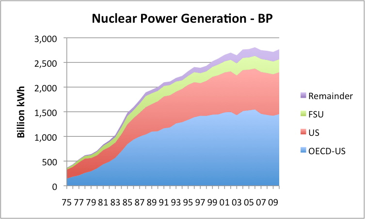 With respect to electricity generated from nuclear energy, the dividing line between the two bets was 2,630 billion kWe. Actual generation was 2767 billion kWe according to BP’s Statistical Review of World Energy, so again Brian is the winner.