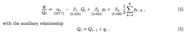 In the above equation, qt is the quantity of oil produced in year t and Qt is the cumulative quantity produced in year t, so the ratio qt / Qt produces the familiar downward-sloping line one sees in charts used for Hubbert Linearization. The first two terms to the right of the equal sign are the ones based on the geological approach to depletion. The later terms depend on pt, which is price of oil at the time “t”. Adding the pt terms tends to raise the line at later periods so it does not slope downward as quickly as if depletion were the only factor affecting the relationship.