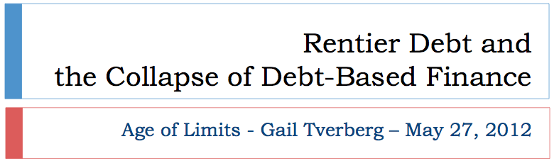 Now that the bubble has been inflated, and we seem to be near collapse, getting rid of rentier debt won’t really “fix” the situation. It is basically too late. The future direction would seem to be contraction, and this will almost certainly eliminate most rentier debt. Our task now would seem to be to deal with all of the dislocations that occur when defaults occur and to develop new financial system(s) that can handle continued contraction.