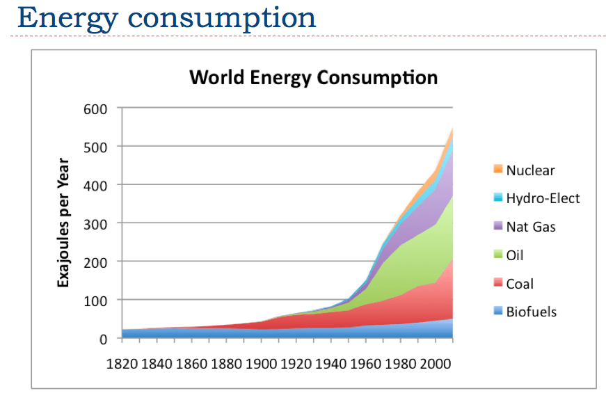 The growth in energy consumption since World War II is even larger on a per-capita basis. Most of this growth was in fossil fuels–in oil and natural gas, and, recently, in coal. Without fossil fuels, our per capita energy consumption in 2012 would be below that in 1820, and our lifestyles would be much different.