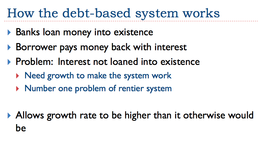 1. The money to repay the debt is not loaned into existence at the same time the principle is loaned into existence. As long as the economy is growing fast enough, this is not a problem, because economic growth allows future production to be enough higher than current production to pay back debt with interest. But if the economy ever slows down, there is a problem.