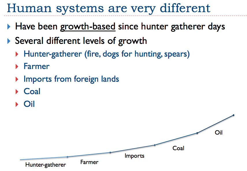 The combination of these factors means that humans have been, and continue to be, on a constant growth tread-mill. There have been examples of small societies that have managed to keep populations flat for relatively long periods, and there have been many societies that have collapsed while others have expanded. The overall aggregate impact of human has been, however, has been one of gradual growth in numbers and material wealth.