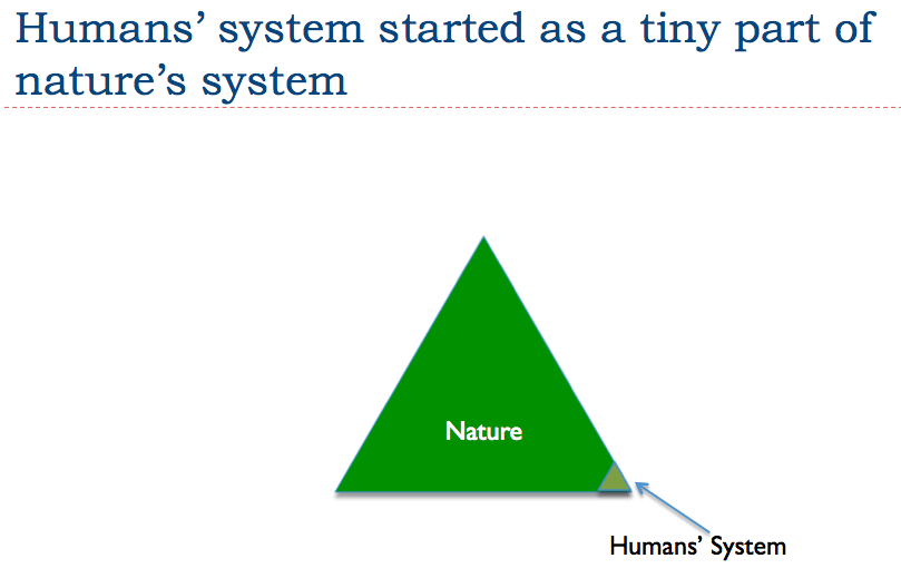 Slide 7 shows my view of what humans’ system looks like now. It has grown in size, so that in many places it overwhelms the natural system. Humans’ system takes resources from nature, and sends its pollution back to nature. Thus it is tied to the natural system, whether we recognize the situation or not.