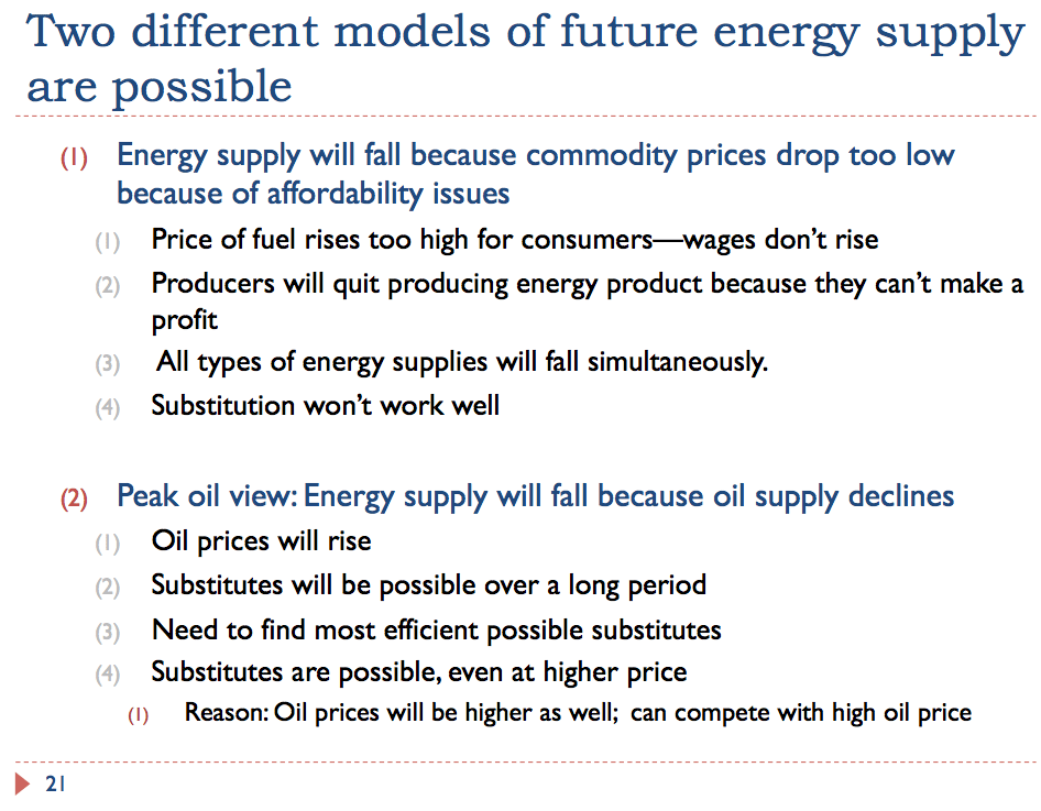 It was not obvious to early researchers which parts of economists’ theories were wrong. I have had the benefit of seeing how the system works in practice in several periods: in 1973-1974, in 2008-2009, and now in 2014-2015. I have also been fortunate enough to find a number of recent studies that add new insights as to how the system really works. So I have taken a step back and developed at the least the start of a new theory, which is different from EROEI theory. This is what I will discuss in the next few sessions.