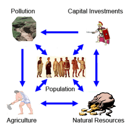 Figure 3. Image by Magne Myrtveit to summarize the main elements of the world model for Limits to Growth.
