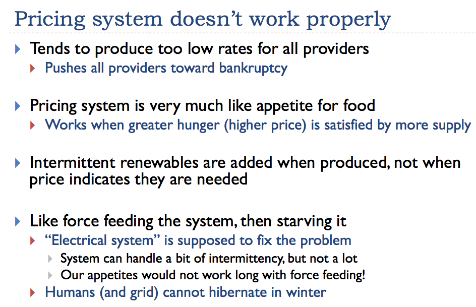 The next problem illustrated in Slide 6 is the fact that the pricing system does not work for any fuel, if wind and solar are given priority on the electric grid. The marginal cost approach that is usually used gives too low a wholesale price for every producer subject to this pricing scheme. The result is a pricing system that gives misleadingly low price signals. Regulators are generally aware of this issue, but don’t have a good way of fixing it. Capacity payments are used in some places as an attempted workaround, but it is not clear that such payments really solve the problem.