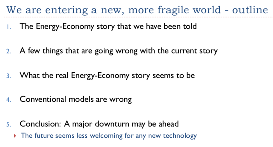 A PDF of my presentation can be found at this link: An Electricity Perspective on the Fragile State of the Economy. In this article, I offer some comments on these slides.