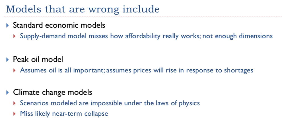 Since I made up this list, I can add another model to the list that seems to be wrong. The Human and Nature Dynamics (HANDY) model of Safa Motesharrei gives an inaccurate assessment of the likely future path of the economy because it leaves out both diminishing returns and long-term population growth.