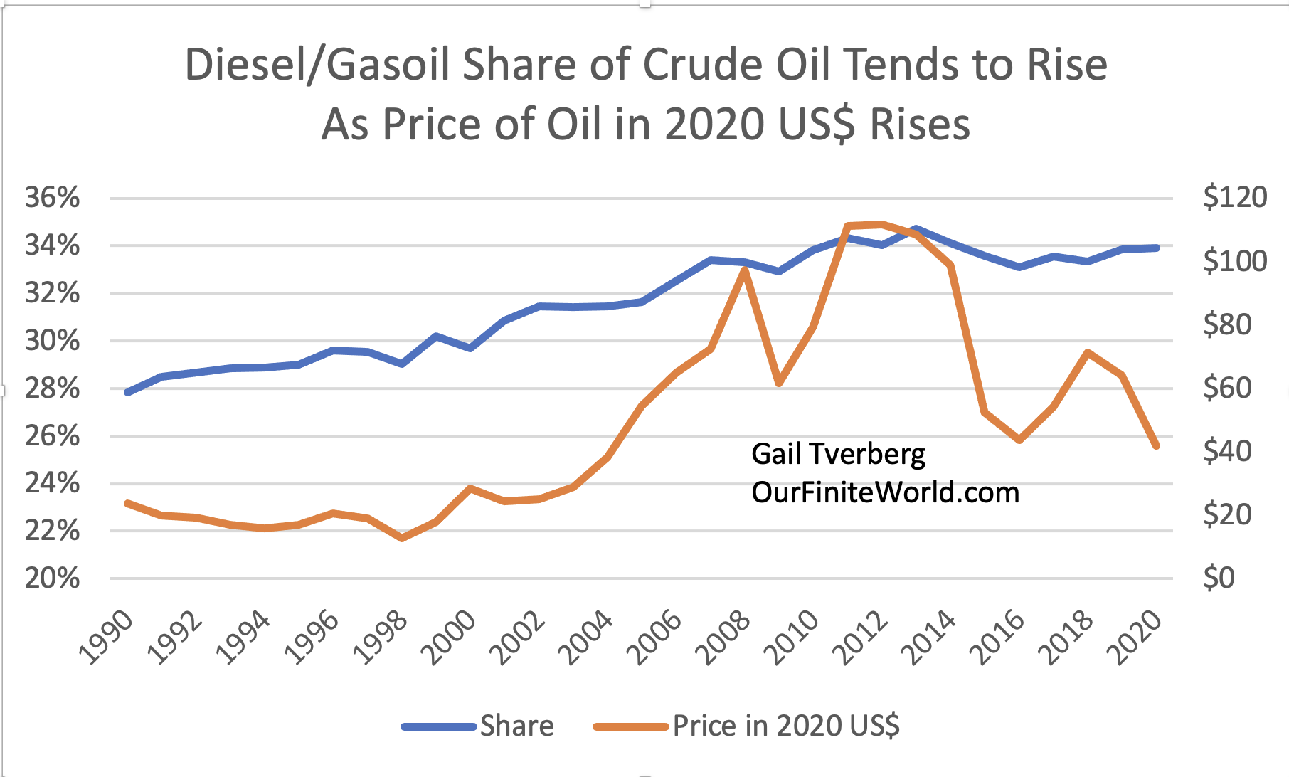 Thus, while growth in US crude oil production greatly supported world growth in crude oil production in the 2009 to 2018 period, it is impossible to see this pattern continuing. Getting crude oil production back up to the level of 12 million barrels a day where it was before the COVID restrictions would be extremely difficult. Further production growth, to support the growing needs of an expanding world population, is likely impossible.