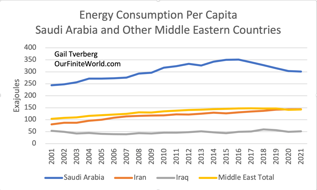 It is my view that when energy supply falls, it falls not because reserves “run out.” It falls because economies around the world cannot afford to purchase goods and services made with energy products and using energy products in their operation. It is really a price problem. Prices cannot be simultaneously high enough for oil producers (such as Russia and Saudi Arabia) to ramp up production and remain low enough for consumers around the world to buy the goods and services that they are accustomed to buying.