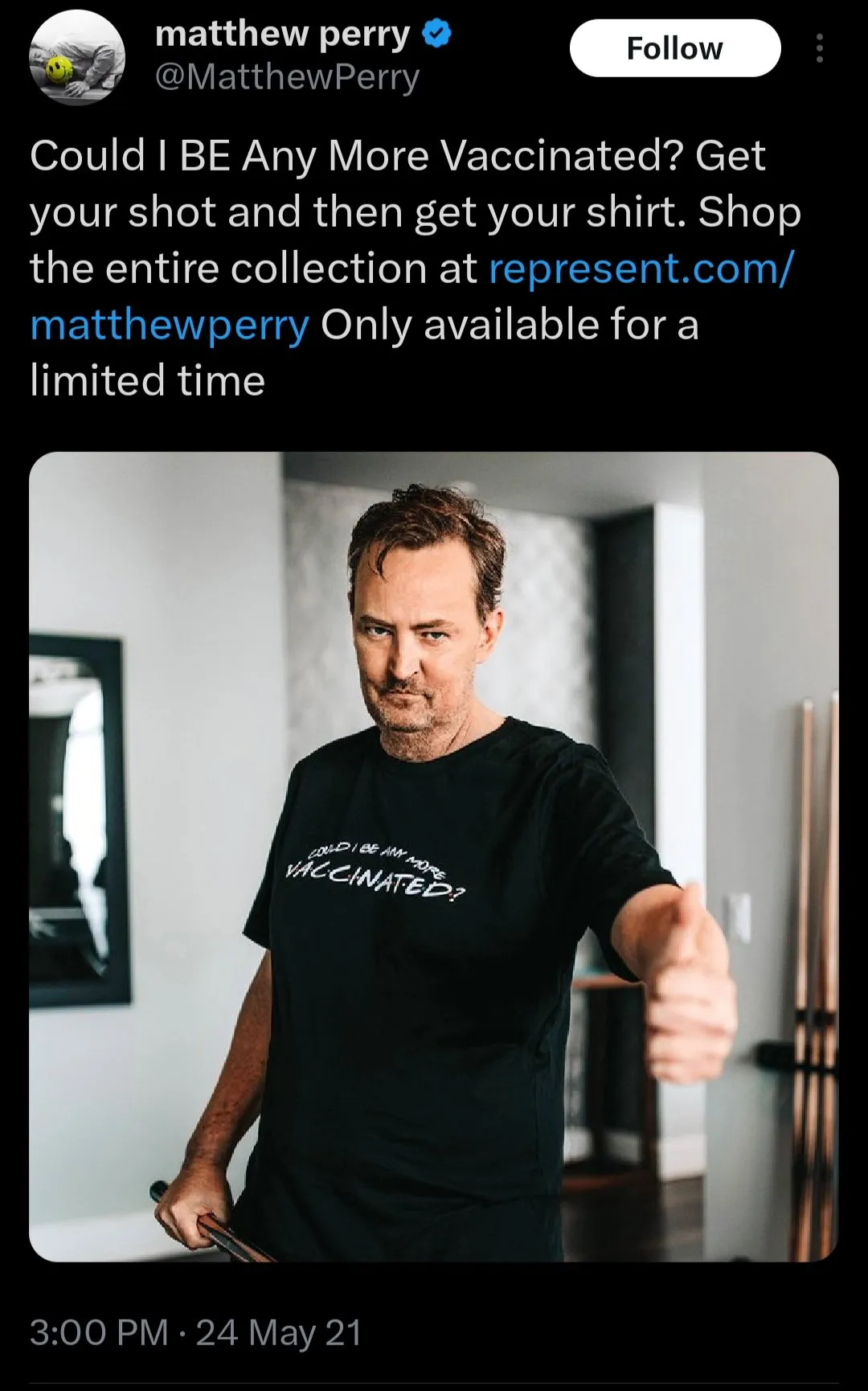 Corporate media seemed completely uninterested in the mysterious nature of Perry’s death. But it wasn’t for privacy this time, since the articles extensively covered Perry’s well-known decades of drug and alcohol addiction (all during the Friends years) and his various surgeries, slyly suggesting the actor died from a drug overdose. Officially Chandler “drowned” alone in a hot tub.