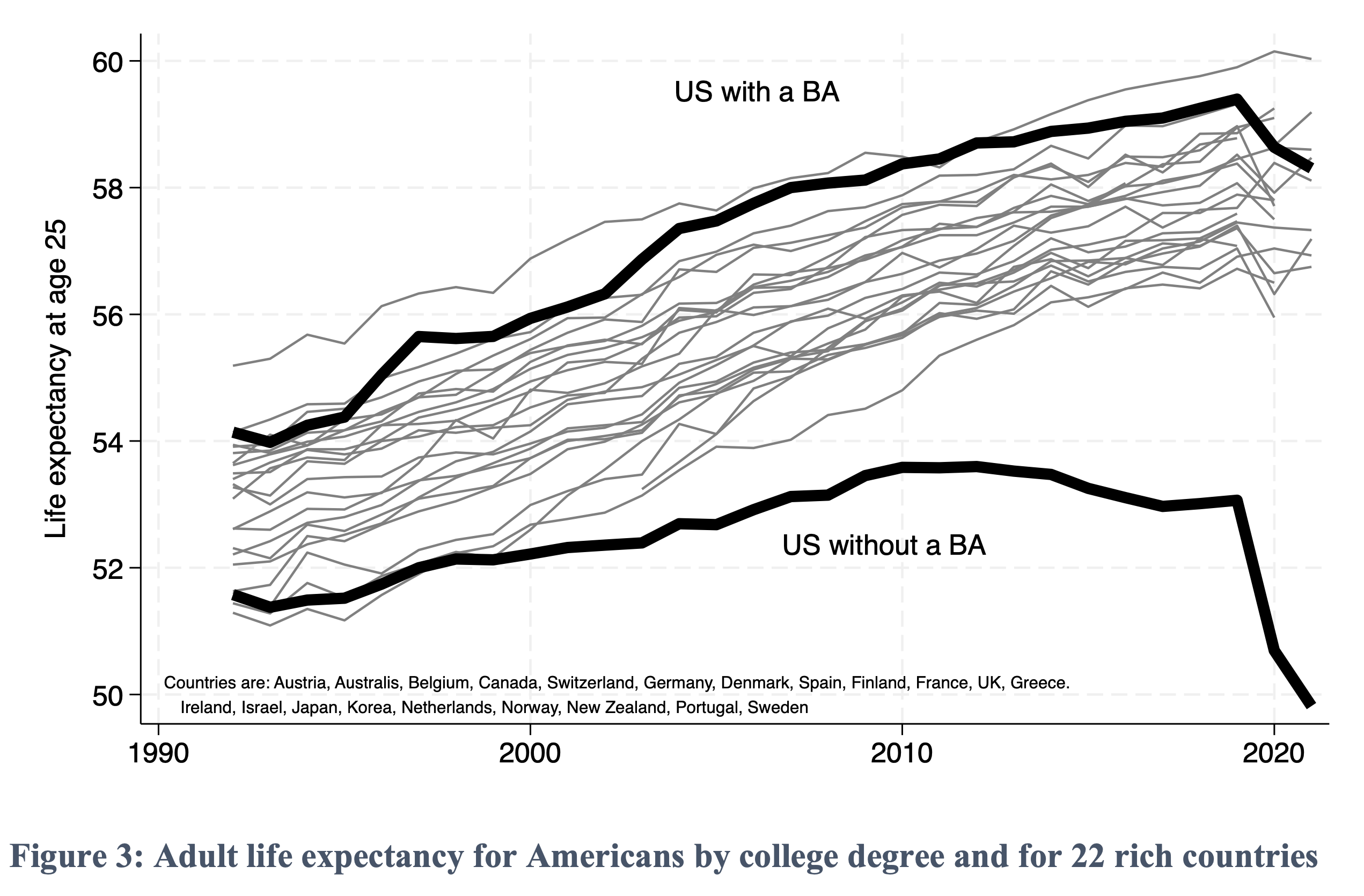 The figure above shows that between 1990 and 2022, the share of total wealth held by the top 1% of US citizens rose from 23% to 32%. This means that other citizens were increasingly squeezed out of the benefits of the growing economy.