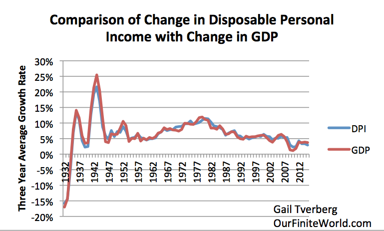 At the same time, the economy seems to have a lot of resilience. Leaders of the US, and perhaps of other countries, as well, seem likely to take the route of adding increasing amounts of debt, to bail themselves out of whatever problems arise. If banks get into trouble, some new funding facility will be developed. If Social Security or private pensions need more funding, it will likely be provided by more government debt. This leads me to suspect that in the US, at least, there is likely to be a higher risk of hyperinflation (lots of money but very little to buy) rather than deflation (very little money, but also very little to buy).