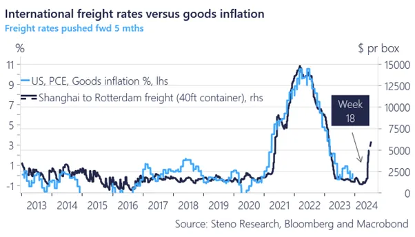 Is the market prepared for a wave of goods inflation arriving from the spring and onwards? Freightco versus US PCE goods inflation.