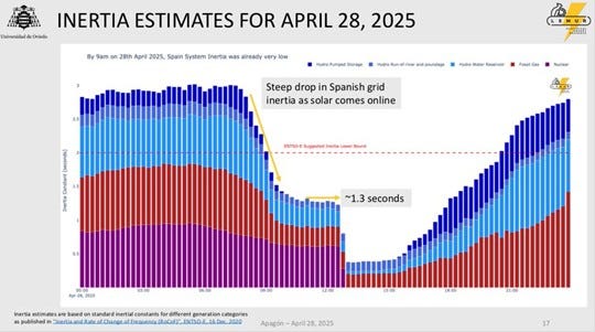 The graph shows that there was huge drop in inertia, as solar power was substituted for other types of electricity. This was important in bringing down the grid.