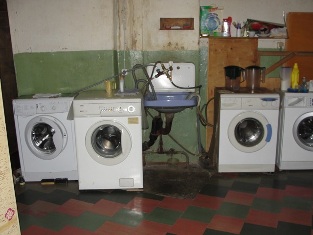 When my husband and I visited St. Petersburg in Russia in 2012, we saw an apartment that had been subdivided so that could be occupied by several (six?) families. There was a single bathroom for the share apartment. There were four clothes washers for the families.