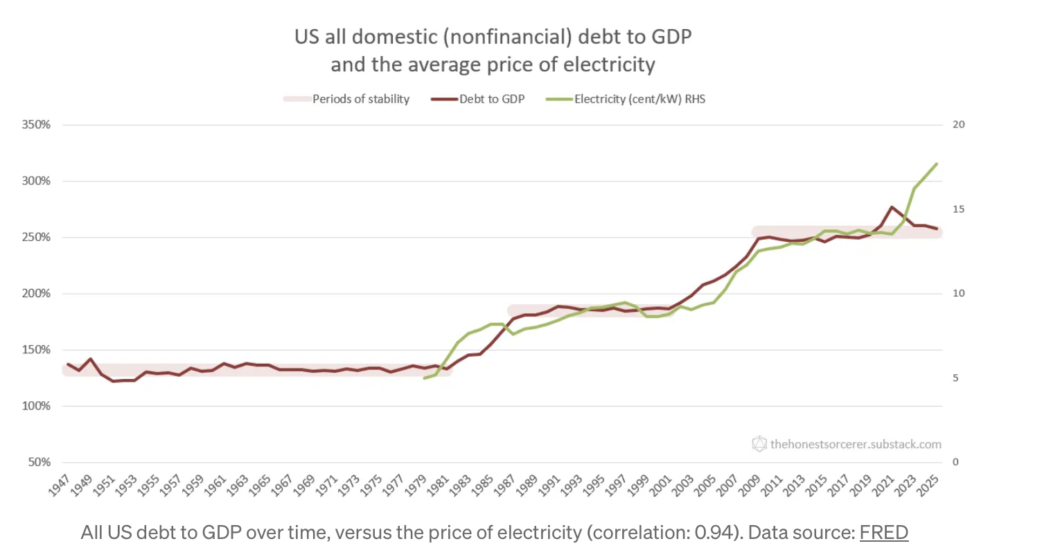 https://ourfiniteworld.com/wp-content/uploads/2025/09/Honest-Sorcerer-electricity-prices-and-US-debt-to-GDP-ratios.png